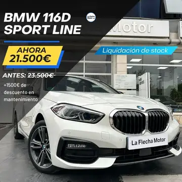 LA FLECHA MOTOR SERVICIO OFICIAL BMW VENDE ESTE : BMW 116da -Vehículo Nacional -Sport Line con asientos deportivos -Volante multifunción -Faros delanteros LED y antinieblas LED. -Paquete de iluminación -Acristalamiento de protección solar. -Asientos delanteros calefactables -Control de crucero con función de frenado -Cuadro de instrumentos digital -Connected Drive Services y Package Plus -Shadow Line 2 llaves Vehículo libre de siniestros. Se entrega certificado de Kilometraje en factura, garantía de 12 meses en servicio OFICIAL BMW y cambios de nombre incluidos en el precio. Atención personalizada vía WhatsApp o teléfono. Se aceptan coches como parte de pago. (PRECIO INCLUIDA BONIFICACIÓN DE -1000€ SIN ENTREGA DE VEHÍCULO A CAMBIO) Posibilidad de entrega en cualquier parte de España. La Flecha Motor especialistas en vehículos de ocasión de mediaalta gama, especialmente en BMW, con más de 25 años de experiencia en Valladolid. Las especificaciones sobre equipamiento, modelo yo precio no tienen carácter vinculante, ni constituyen base de futuro contrato al poder contener algún error. - Reservado el derecho a su venta final y modificaciones.