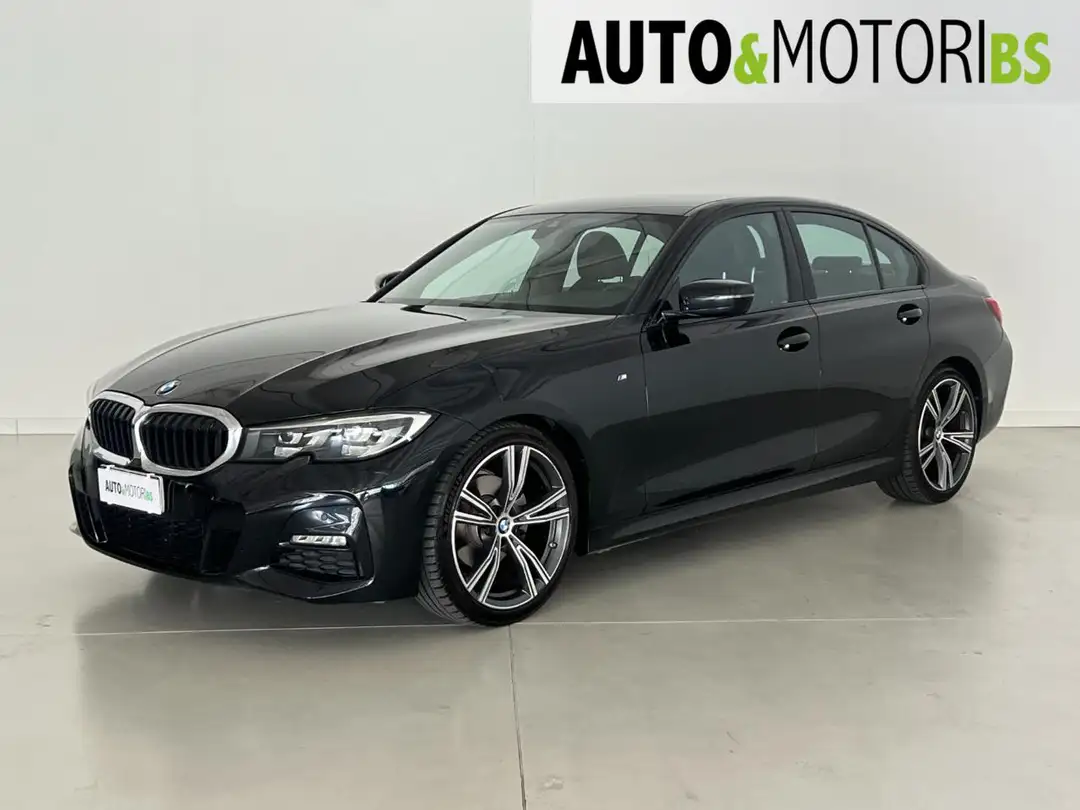 BMW 320 d 48V, pacchetto Msport, diesel Euro 6d, cambio automatico Sportivo Steptronic a 8 rapporti con paddle al volante, vernice nera Black Sapphire metallizzata, Shadow line esterna lucida, spoiler posteriore M e cerchi in lega bicolore da 19 pollici individual doppi raggi.