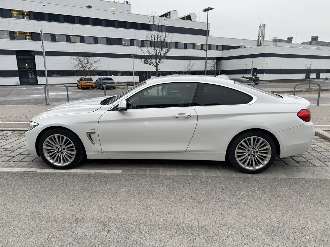 Zum Verkauf steht ein BMW 420d xDrive Coupé F32 (Luxury Line) in Weiß mit brauner Leder-Innenausstattung.