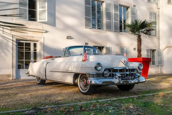 Présentée au début des années 50, la Cadillac Série 62 Cabriolet illustre une période où la marque s'impose comme référence du style américain. Le modèle repose sur un vaste châssis à propulsion, animé par un V8 de 162 chevaux, un moteur pensé avant tout pour la souplesse et la conduite longue distance. La boîte automatique Hydra-Matic, déjà bien installée chez Cadillac, accompagne ce caractère posé, typique des grandes américaines d'après-guerre.
