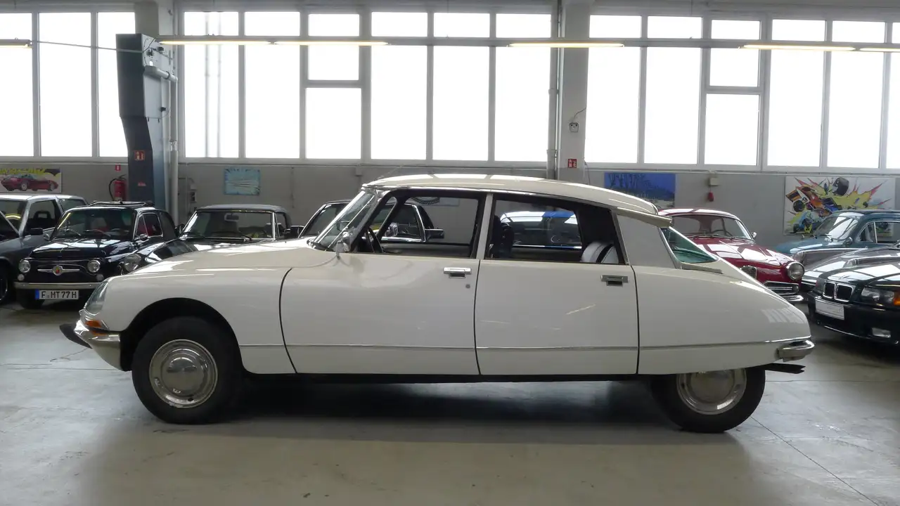 Citroen DSuper 5, aus dem Baujahr 1973 in weiß mit neuer blauer Innenausstattung aus Leder.
