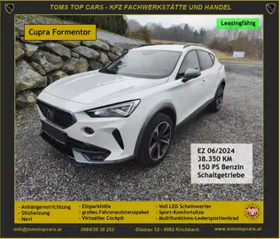 Cupra Formentor, EZ 06/2024, 38.350 KM, 150 PS Benzin, Schaltgetriebe, weiss, Glanzpaket (Innenreinigung u. Politur), Werkstattgeprüft, Transparente Fahrzeughistorie, LEASINGFÄHIG
