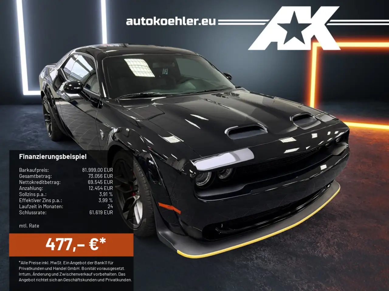 *Ein Bank 11Ballonfinanzierung-Finanzierungsbeispiel der Bank11 für Privatkunden und Handel GmbH, Hammer Landstraße 91, 41460 Neuss für Privatkunden und Geschäftskunden: 476,53 EUR monatl. Rate, 3,99 Prozent eff. Jahreszins bei 24 Monaten Laufzeit, einer Anzahlung von 12.453,62 EUR, einer jährlichen Laufleistung von 10.000 km und einer Schlussrate von 61.619,21 EUR. (Sollzins gebunden p.a. 3,91 Prozent, Bruttokreditbetrag: 73.055,93 EUR, Nettokreditbetrag: 69.545,38 EUR)