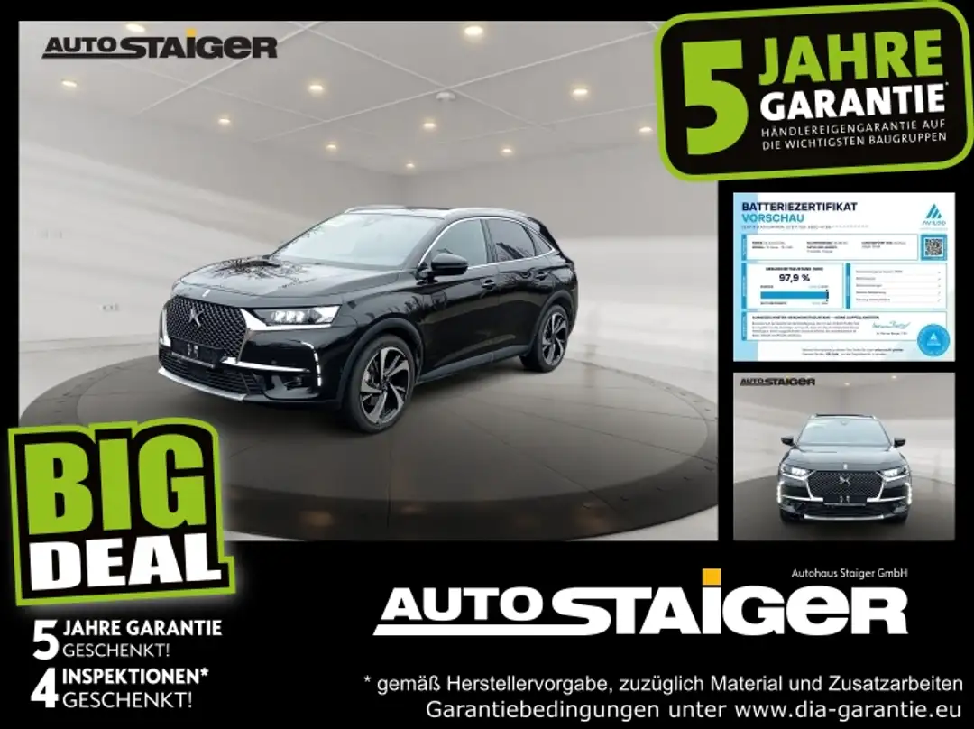 Elektrisches Fahren im AlltagBis zu 55 ,km rein elektrische Reichweite (WLTP) – ideal für tägliche Stadtfahrten oder den Arbeitsweg ohne EmissionenGeringere BetriebskostenUmweltbonus, mögliche Kfz-Steuerbefreiung und niedriger Verbrauch machen den DS 7 besonders wirtschaftlich im UnterhaltStarke Leistung bei hoher EffizienzMit 225 PS kombiniert der Plug-in-Hybrid souveräne Fahrleistungen mit modernem Antrieb und reduziertem CO₂,-AusstoßFranzösischer Premium-KomfortEdle Materialien, durchdachte Details und ein eleganter Innenraum sorgen für ein besonderes FahrerlebnisModerne AssistenzsystemeLeises und entspanntes FahrenIm Elektrobetrieb nahezu lautlos – ideal für ruhige Fahrten im Stadtverkehr oder in WohngebietenFamilien- und alltagstauglichGeräumiger Innenraum, großer Kofferraum (bis zu 555 ,l) und hohe Alltagstauglichkeit für Familien und aktive Fahrer,