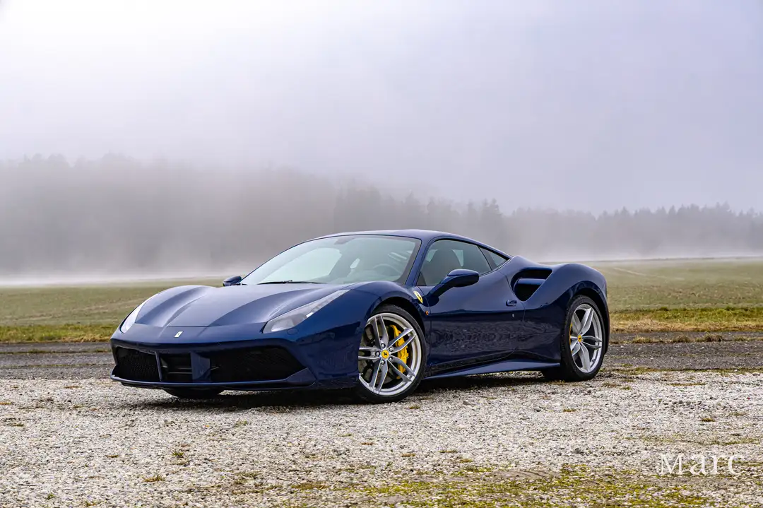 Konfiguriert ist der Wagen in einer klassischen blau/beige Kombination mit einer Lackierung in Blue Tour de France über Leder Cuoio mit Daytona Sitzdesign. Darüber hinaus wurde der 488 GTB mit sehr vielen Extras ausgestattet: