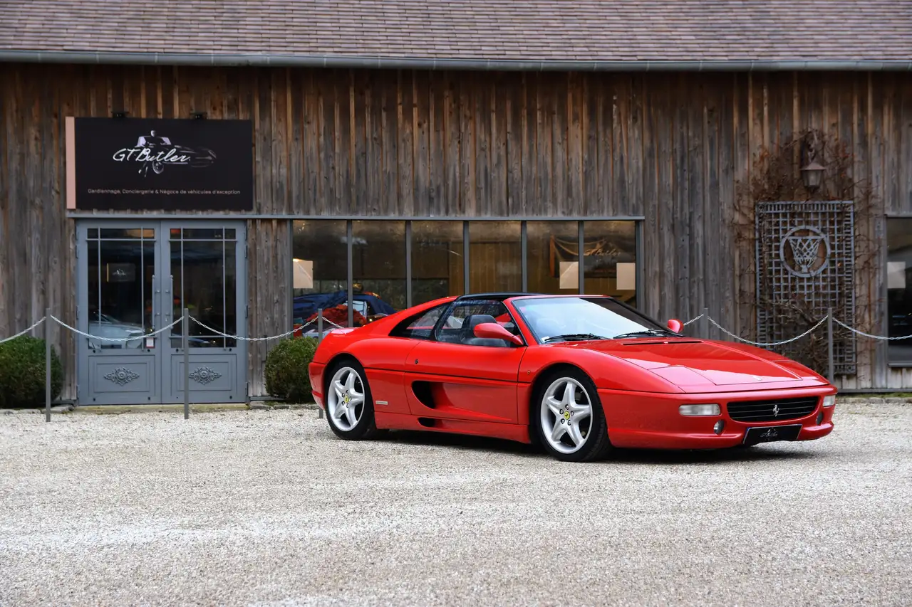 Envie d’une véritable italienne ? GT Butler vous ouvre les portes de la Scuderia avec cette superbe Ferrari F355 GTS. Ligne intemporelle, caractère pur, sensations à l’état brut : tout est réuni pour vivre une expérience qui ne se raconte pas, mais se conduit. La F355 GTS est l’héritière de la 348 TB. Construite entre 1994 et 1999 la 355 a été un franc succès pour la marque au cheval cabré. Dotée d’un V8 de 380cv en position centrale arrière, cette voiture vous emmènera faire vos plus belles balades. Dans sa version GTS, la plus désirable, elle permet de profiter des vocalises de ce V8 les cheveux au vent. Elle incarne la liberté mais aussi la performance italienne « made in Maranello » ; une conduite précise, grisante et musicale, à la fois joueuse et chirurgicale. Le modèle que nous vous proposons est une Ferrari 355 GTS de 1996 (5.2), disposant d’un historique complet, chez Ferrari jusqu’en 2008 et par la suite auprès de spécialistes. Cette GTS n’affiche que 52 700 kms, elle sort d’entretien avec remplacement de la distribution et est excellent état. CONFIGURATION Cette 355 a été livrée en Allemagne en 1996 et est en France depuis 2022. Disposant de la traditionnelle peinture « Rosso Corsa » cette voiture est fournie avec 2 hardtops, un de couleur noire de série et le second en teinte carrosserie. La configuration est classique et sportive : peinture Rosso Corsa, intérieur cuir noir, jantes magnesium grises.La F355 GTS est motorisée par le superbe V8 3.5L atmosphérique développant 380 CV, associé à la célèbre et désirable boîte mécanique en H à 6 rapports.Notre modèle est entièrement d’origine à l’exception du volant, remplacé pour un volant type 328 à 3 branches en cuir noir, surpiqures rouges. Le volant airbag d’origine est fourni avec la voiture.