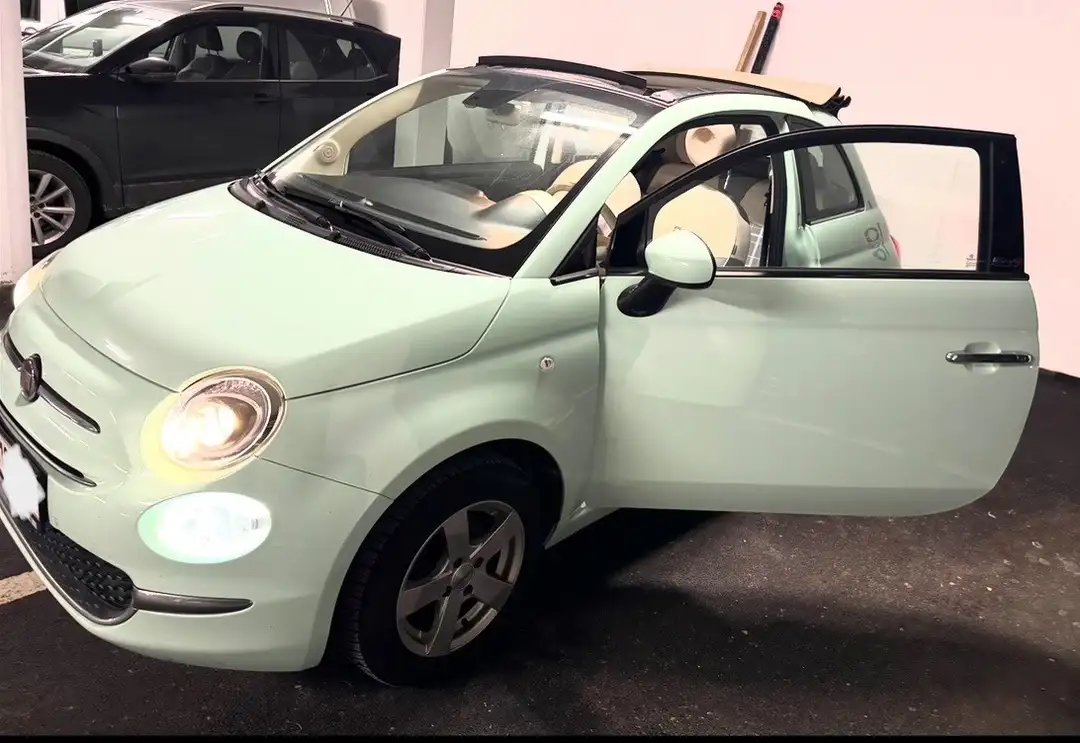 Zum Verkauf steht ein gepflegter Fiat 500C in wunderschönem Mintgrün mit beigem Cabrio-Dach – ein echter Hingucker mit viel Charme.