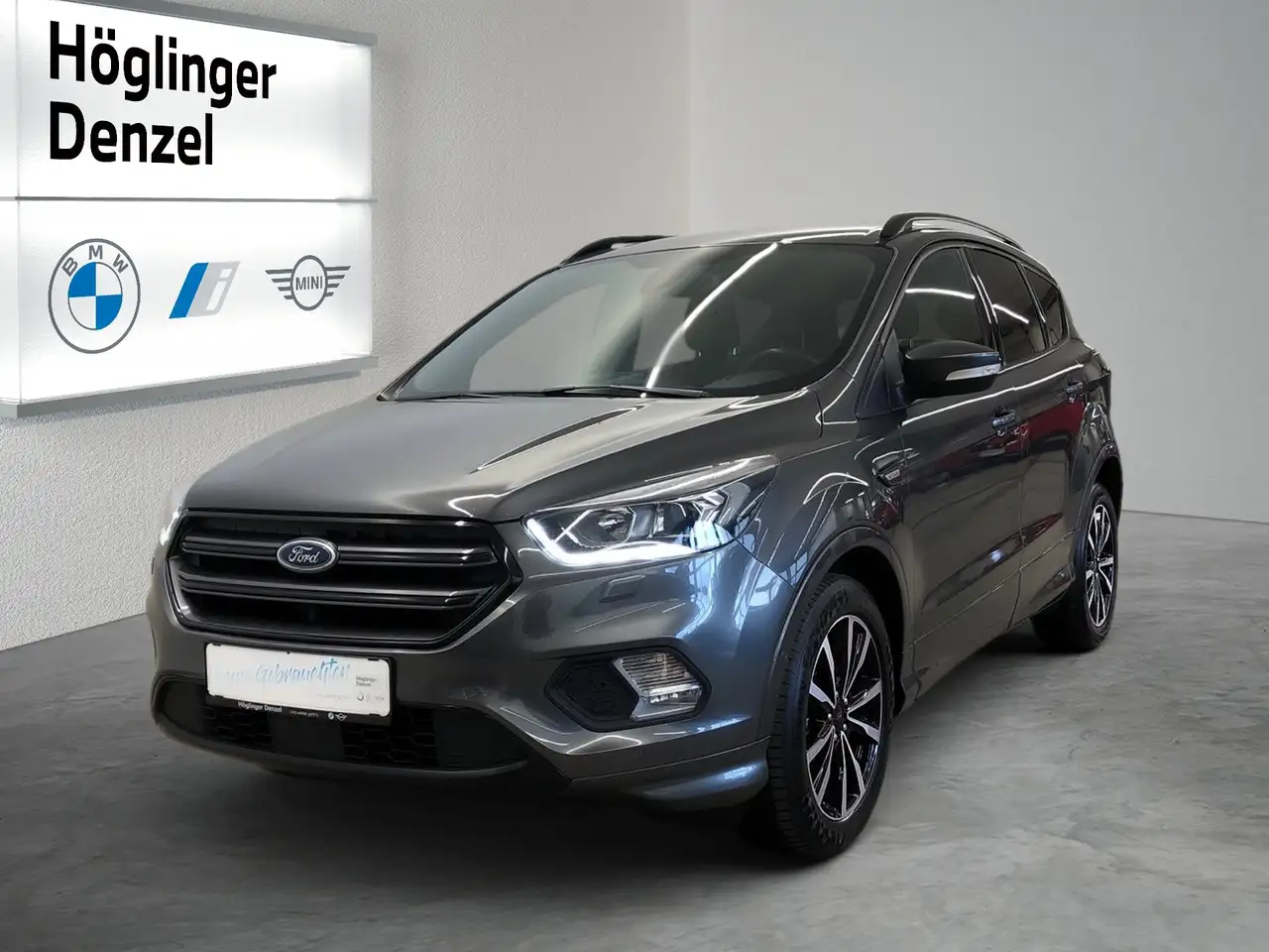 Aktiver Einpark-Assistent inkl., Auspuffanlage mit Doppel-Endrohr, Auto-Start/Stop-System, Beifahrersitz 4fach manuell einstellbar (vor/zurück, Lehne), Beifahrersitz 6fach manuell einstellbar - (vor/zurück, hinauf/hinunter, Lehne), Body Styling Kit, Chrom-Dekor-Umrandung der Seitenscheiben, Dachhimmel aus dunklem Webstoff, Dachkonsole (kurz) mit Staufach für Sonnenbrille und Mikrofonvorbereitung, Einstiegszierleisten vorn, aus Edelstahl mit Kuga Logo, Einstiegszierleisten, vorn mit ST-Line Logo, Fahrersitz 6fach manuell einstellbar, Fensterheber vorn und hinten, elektrisch, Ford Easy Fuel (Komfort-Tankverschluss und Fehlbetankungschutz), Ford Power Startfunktion, schlüsselfreies Starten über den Ford Power-Startknopf, Garantie 2 Jahre, Garantie 5 Jahre, Handschuhfach, beleuchtet, Heckklappengriff in Wagenfarbe lackiert, Intelligentes Sicherheits-System (IPS Intelligent Protection System), Kartentaschen an den Rücklehnen der Vordersitze, Lederschaltknauf im ST-Design, Leder-Stoff-Polsterung in "Rauhlederoptik", Leichtmetallräder 7,5 J x 18 im 5x2-Speichen-Design mit 235/50 R 18 Reifen, Lenksäule in Höhe und Reichweite einstellbar, Mittelkonsole mit offener Ablage und mechanischer Handbremse, Mittelkonsole Premium mit Armauflage und Staufächern inkl. Handbremse elektrisch, MyKee-Schlüsselsystem, Notbremslicht, Warnblinkaktivierung bei starkem Bremsen, Oberer Frontgrill mit Streben in Anthrazit und scharzer Umrandung, Pedalerie mit Aluminium-Auflagen, Reifen-Reparatur-Set, Scheibenwischer mit Intervallschaltung (6 Geschwindigkeitsstufen), Scheinwerfer, dunkel abgesetz, Scheinwerfer-Assistent mit Tag-/Nacht-Sensor mit Ausschaltverzögerung, Schwarze Dekor-Umrandung der Seitenscheiben, Sonnenblende mit Spiegel, beleuchtet, für Fahrer und Beifahrer, Stoßfänger vorne und hinten in Wagenfarbe lackiert, Türgriffe in Wagenfarbe lackiert, Unterer Frontgrill mit Waben-Design mit Umrandung in Schwarz, Warnsystem für nicht angelegten Fahrer- und Beifahrersicherheitsgurt