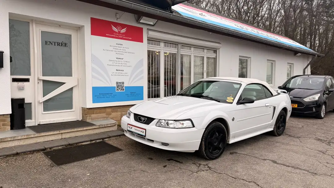 Zum Verkaf steet e schéine Ford Mustang Cabriolet a wäisser Aussenfaarf mat schwaarzem Stoffdaach. Den Auto huet e sportlechen an gläichzäiteg klassesche Look, mat schwaarze Felgen an der typescher Mustang-Front mam markanten Grill an dem legendäre Päerd-Logo.