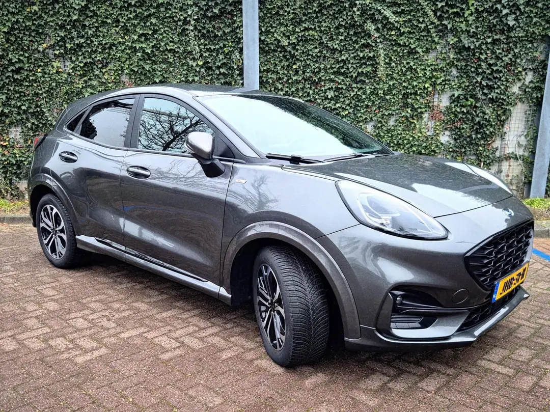 Ford Puma 1.0 EcoBoost Hybrid ST-Line Automaat Deze grijze 2024-uitvoering is praktisch nieuw en combineert de kracht van benzine met de efficiëntie van mild-hybride techniek.