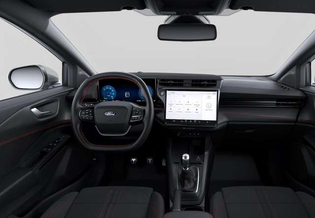 Verglasung hinten abgedunkelt (Privacy Glass), Dachhimmel schwarz, Einstiegszierleisten vorn, ST-Line-Design, Fahrassistenz-System Pre-Collision-System: Auffahrwarnsystem, Ford Audio-Navigationssystem SYNC 4, Klimaautomatik 1-Zonen, Leuchtweitenregulierung vorn, LM-Felgen 7x17, Mittelkonsole mit Armlehne und Getränkehalter vorn, Notrufsystem eCall, Pedalerie mit Aluminium-Auflagen, Reifen 215/55 R17, Schadstoffarm nach Abgasnorm Euro 6e (EU6 EA), Sitzbezug / Polsterung: Stoff mit roten Nähten, Smartphone-Schnittstelle (Apple CarPlay & Android Auto), Sportfahrwerk, Intelligent Protection System (IPS) (Gurtstraffer / Warnanlage für Sicherheitsgurte hinten / Warnanlage für Sicherheitsgurte vorn / Airbag Beifahrerseite abschaltbar / Airbag Fahrer-/Beifahrerseite / Kopf-Schulter-Airbag vorn und hinten / Seitenairbag vorn), 6 Lautsprecher, Ambiente-Beleuchtung vorn (LED), Farbdisplay (12 Zoll), Innenraumfilter: Staub- und Pollenfilter, Karosserie: 5-türig, Lendenwirbelstütze Sitz vorn links, Mild-Hybrid 92 kW (Motor 1,0 Ltr. - 92 kW EcoBoost), Otto-Partikelfilter (OPF), Radioempfang digital (DAB), Radstand 2588 mm, Standard Variante, Türgriffe außen Wagenfarbe, Anti-Blockier-System (ABS), Antischlupfregelung (ASR), Antriebsart: Frontantrieb, Elektron. Stabilitäts-Programm (ESP), Getriebe 6-Gang - Typ: 6MX65, Fensterheber elektrisch vorn + hinten mit Komfortschließung, Power KeyFree-Startfunktion, Sportsitze vorn, Zentralverriegelung mit Fernbedienung, Eco-Anzeige für verbrauchsoptimiertes Fahren (EcoCoach), Fahrassistenz-System: Verkehrsschildassistent, Geschwindigkeits-Regelanlage (Tempomat), Rückfahrkamera, Audiobedienung am Lenkrad, Lenkrad (Leder 3-Speichen), Servolenkung elektrisch, Außenspiegel elektr. verstell- und heizbar, Fahrassistenz-System: Fernlichtassistent (Scheinwerfer mit Abblendautomatik), Heckleuchten LED, Scheibenwischer mit Regensensor, Scheinwerfer LED, Tagfahrlicht LED, Einparkhilfe hinten, Fahrassistenz-System: Spurhalteassistent mit Müdigkeitserkennungs-Sensor, Reifendruck-Kontrollsystem, Rußpartikelfilter, Start/Stop-Anlage