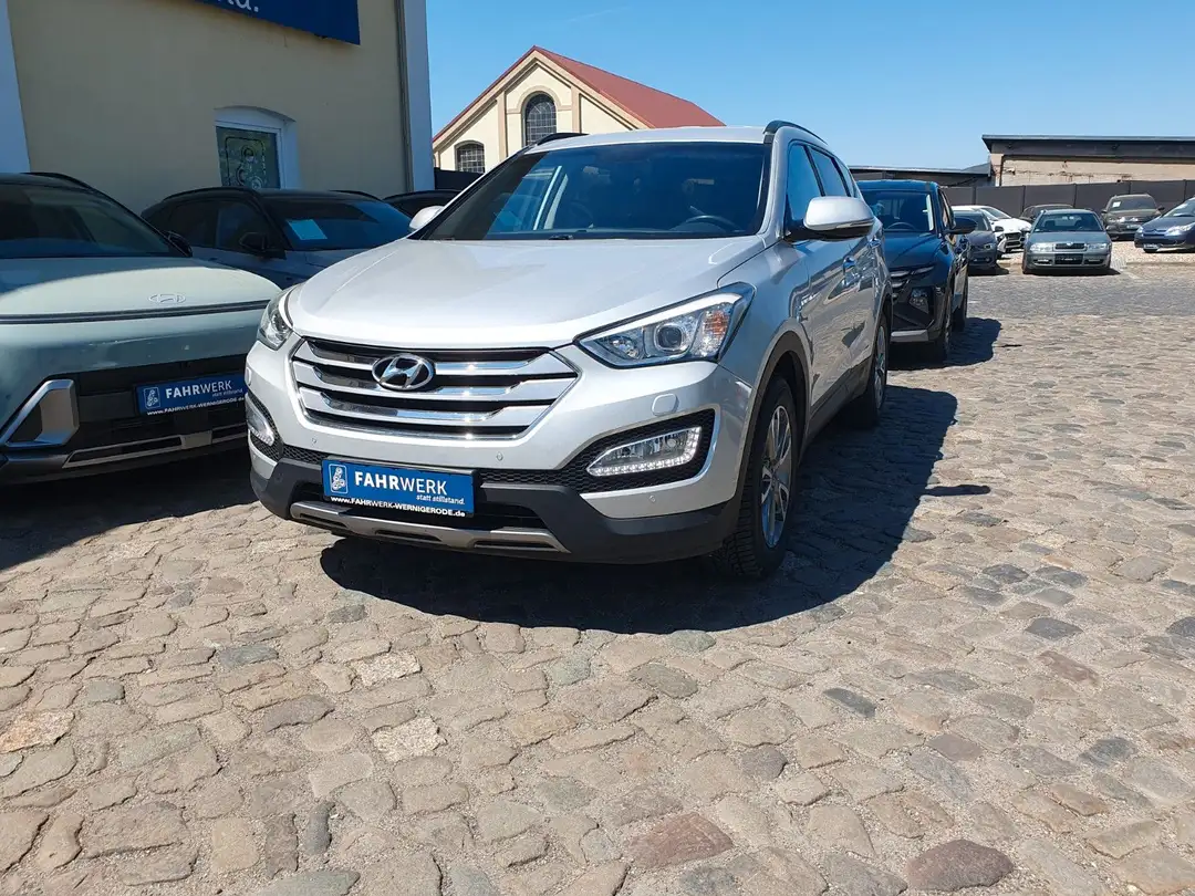 Xenon-Scheinwerfer - Scheinwerfer-Reinigungsanlage - Kurvenlicht, statisch, Klimaautomatik Zweizonen-Temperaturregelung, inkl. Pollenfilter und Umluftschalter, Geschwindigkeits-Regelanlage, Rückfahrkamera, Servolenkung mit Flex Steer (variable elektrische Lenkunterstützung in den Modi Normal, Comfort und Sport), Sitzheizung vorne, Bordcomputer mit Anzeige von Durchschnitts- und Momentanverbrauch, Reichweite, Durchschnittsgeschwindigkeit und Tageskilometerzähler, Radio: Integriertes CD-Radio mit MP3-Funktion - 6 Lautsprecher inklusive 2 Hochtönern - RDS-Radio - CD-Player inklusive MP3-Wiedergabefunktion - Radiofernbedienung über Lenkradtasten, Regensensor, Traktionskontrolle, Telefon: Bluetooth-Freisprecheinrichtung für Mobiltelefone, inkl. Sprachsteuerung, Ablagen, Airbag: Full-Size-Fahrer-/Beifahrer, Airbag: Knieairbag auf der Fahrerseite, Airbag: Seitenairbags vorn, Airbag: Vorhangairbags in den Längsholme, Alarmanlage, Antiblockiersystem (ABS) mit EBV, Außenspiegel el. verstell- u. beheizbar, Außentemperaturanzeige, Bergabfahrassistent (Downhill Brake Cont, Berganfahrassistent (HAC), Bremsassistent, Dachreling, Dieselpartikelfilter, Drehzahlmesser, Dritte Bremsleuchte, Einparkhilfe hinten, Elektronisches Stabilitätsprogramm (ESC), Fensterheber elektrisch vorn und hinten, Gepäckraum, mit Ablagefach unter dem Bod, Gepäckraumabdeckung, Getriebe: 6-Gang-Schaltgetriebe, Grundausstattung Santa Fe, Heckscheiben-Wisch-/Waschanlage, Heckspoiler, in Wagenfarbe lackiert, Innenspiegel, automatisch abblendend, Kopfstützen vorn und hinten verstellbar, LED-Tagfahrleuchten, Lackierung: Metallic-Lackierung, Leichtmetallfelgen 7J X 18"", Lenkrad u.Schalt-/Wählheb.mit Lederbezug, Lenksäule manuell längs- und neigungsver, Leuchtweitenregulierung, automatisch, Licht-aus-Automatik, Lichtsensor, Mittelarmlehne hinten, Mittelarmlehne vorn mit Ablagefach, Nebelscheinwerfer, Polster: Lederausstattung, Radiozubehör: Anschl. für USB, AUX, iPod, Rücksitzbank- u. Lehne geteilt umklappb., Scheiben rundum getönt, Scheiben: dunkel getönt ab B-Säule, Sicherheitsgurte Santa Fe, Sitz: Fahrer verst. Lendenwirbelstütze, Sitze: Fahrersitz höhen- und neigungsver, Sitze: ISOFIX-Kindersitzbefestigung, Unterfahrschutz vorne und hinten, silber, Wegfahrsperre, elektronisch, Zentralverriegelung m. Funkfernbedienung,