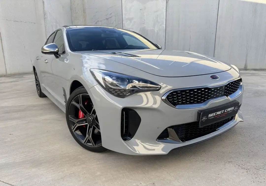 Se vende Kia Stinger GT en color Ceramic Silver (gris plata metalizado), con interior en cuero negro, una combinación elegante y muy demandada.
