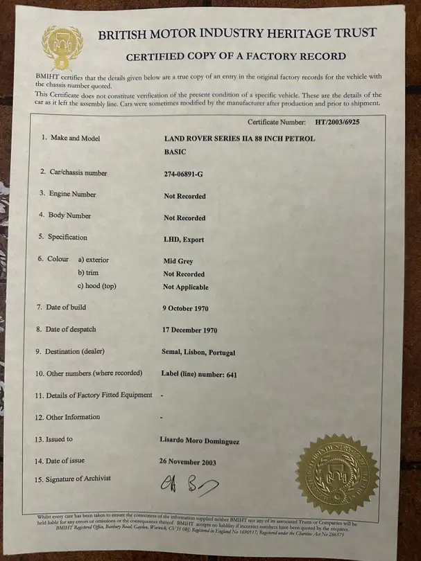 Dispone de lona en buen estado y certificado Heritage Trust, que acredita su autenticidad. Cuenta con matrícula histórica, lo que ofrece ventajas como ITV cada 4 años y posible exención del impuesto de circulación, según el ayuntamiento.
