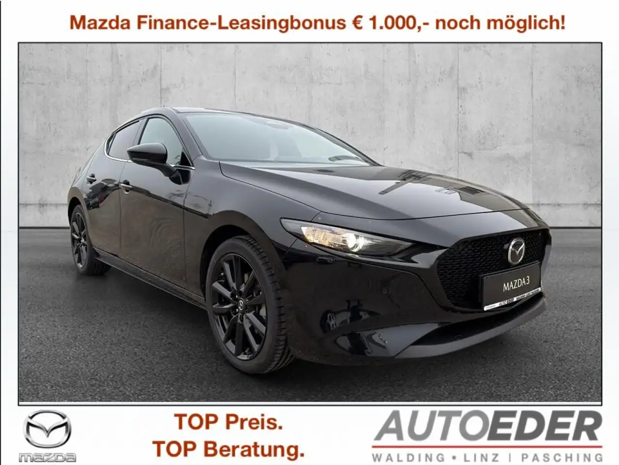 Preis bei Leasing Mazda Finance 29.380,-- AUTO EDER - VERSICHERUNGSPAKET Mazda 3 ab 113,-- mtl. in Stufe 0 Inkl.Haftpflicht-Vers. 15 Mio. Deckung Inkl. Vollkasko mit SB 150,-- Inkl.Total-Verkehrs-Rechtschutz inkl.Insassenunfall !!! Die Informationen zu diesem Fahrzeug dient nur zur Werbung und stellt kein organisiertes Vertriebs- oder Dienstleistungssystem dar. Eine allfällige Zusendung eines Vertragsentwurfs (Kaufantragsentwurf) per E-Mail dient der bloßen Information und hat keinerlei Bindungswirkung. Erst nach einer Besichtigung und einer Probefahrt des Fahrzeuges (wenn vom Interessenten gewünscht) wird in unseren Geschäftsräumlichkeiten ein schriftlicher bindender Kaufvertrag (Kaufantrag) zur Unterfertigung angeboten. (laut WKO)