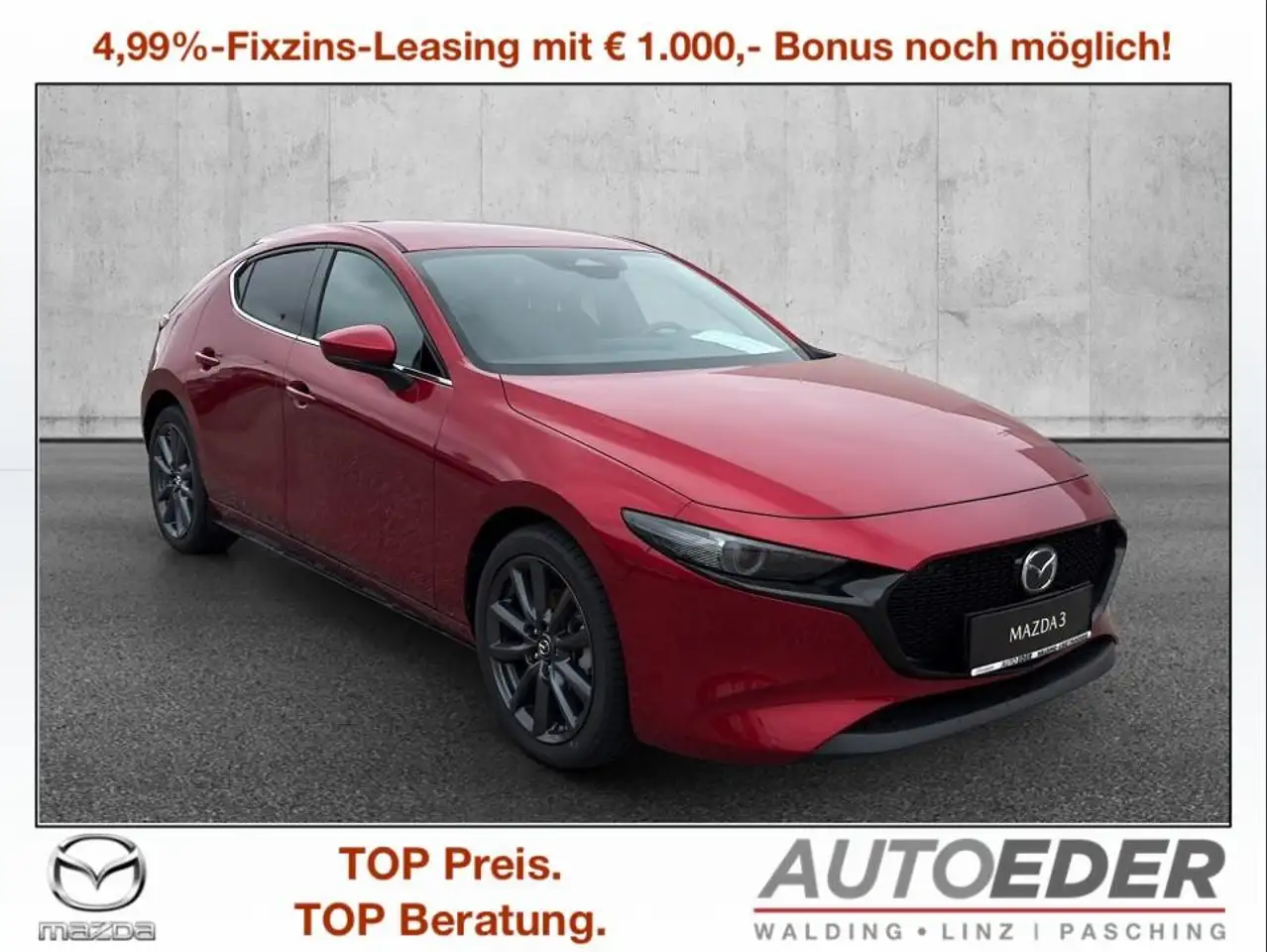 Preis bei Leasing Mazda Finance 30.990,-- AUTO EDER - VERSICHERUNGSPAKET Mazda 3 ab 113,-- mtl. in Stufe 0 Inkl.Haftpflicht-Vers. 15 Mio. Deckung Inkl. Vollkasko mit SB 150,-- Inkl.Total-Verkehrs-Rechtschutz inkl.Insassenunfall !!! Die Informationen zu diesem Fahrzeug dient nur zur Werbung und stellt kein organisiertes Vertriebs- oder Dienstleistungssystem dar. Eine allfällige Zusendung eines Vertragsentwurfs (Kaufantragsentwurf) per E-Mail dient der bloßen Information und hat keinerlei Bindungswirkung. Erst nach einer Besichtigung und einer Probefahrt des Fahrzeuges (wenn vom Interessenten gewünscht) wird in unseren Geschäftsräumlichkeiten ein schriftlicher bindender Kaufvertrag (Kaufantrag) zur Unterfertigung angeboten. (laut WKO)