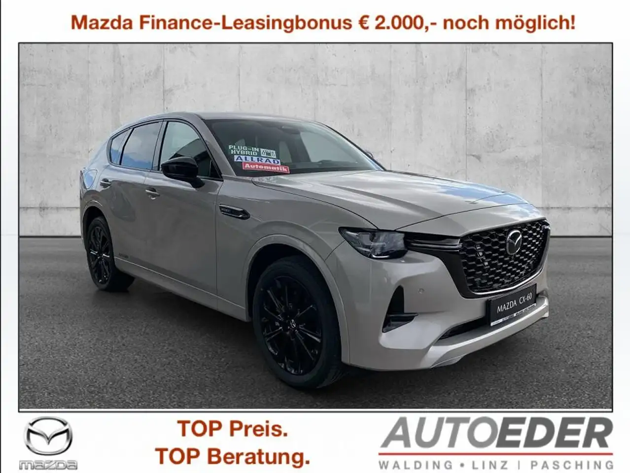 AUTO EDER - VERSICHERUNGSPAKET Mazda CX 60 ab 173,-- mtl. in Stufe 0 Inkl.Haftpflicht-Vers. 15 Mio. Deckung Inkl. Vollkasko mit SB 150,-- Inkl.Total-Verkehrs-Rechtschutz inkl.Insassenunfall !!! Die Informationen zu diesem Fahrzeug dient nur zur Werbung und stellt kein organisiertes Vertriebs- oder Dienstleistungssystem dar. Eine allfällige Zusendung eines Vertragsentwurfs (Kaufantragsentwurf) per E-Mail dient der bloßen Information und hat keinerlei Bindungswirkung. Erst nach einer Besichtigung und einer Probefahrt des Fahrzeuges (wenn vom Interessenten gewünscht) wird in unseren Geschäftsräumlichkeiten ein schriftlicher bindender Kaufvertrag (Kaufantrag) zur Unterfertigung angeboten. (laut WKO)
