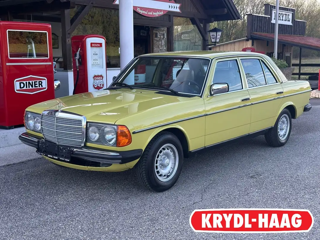 Zum Verkauf steht ein wunderschöner Mercedes-Benz 200 W123 mit Automatikgetriebe in Mimosengelb und grüner Innenausstattung.