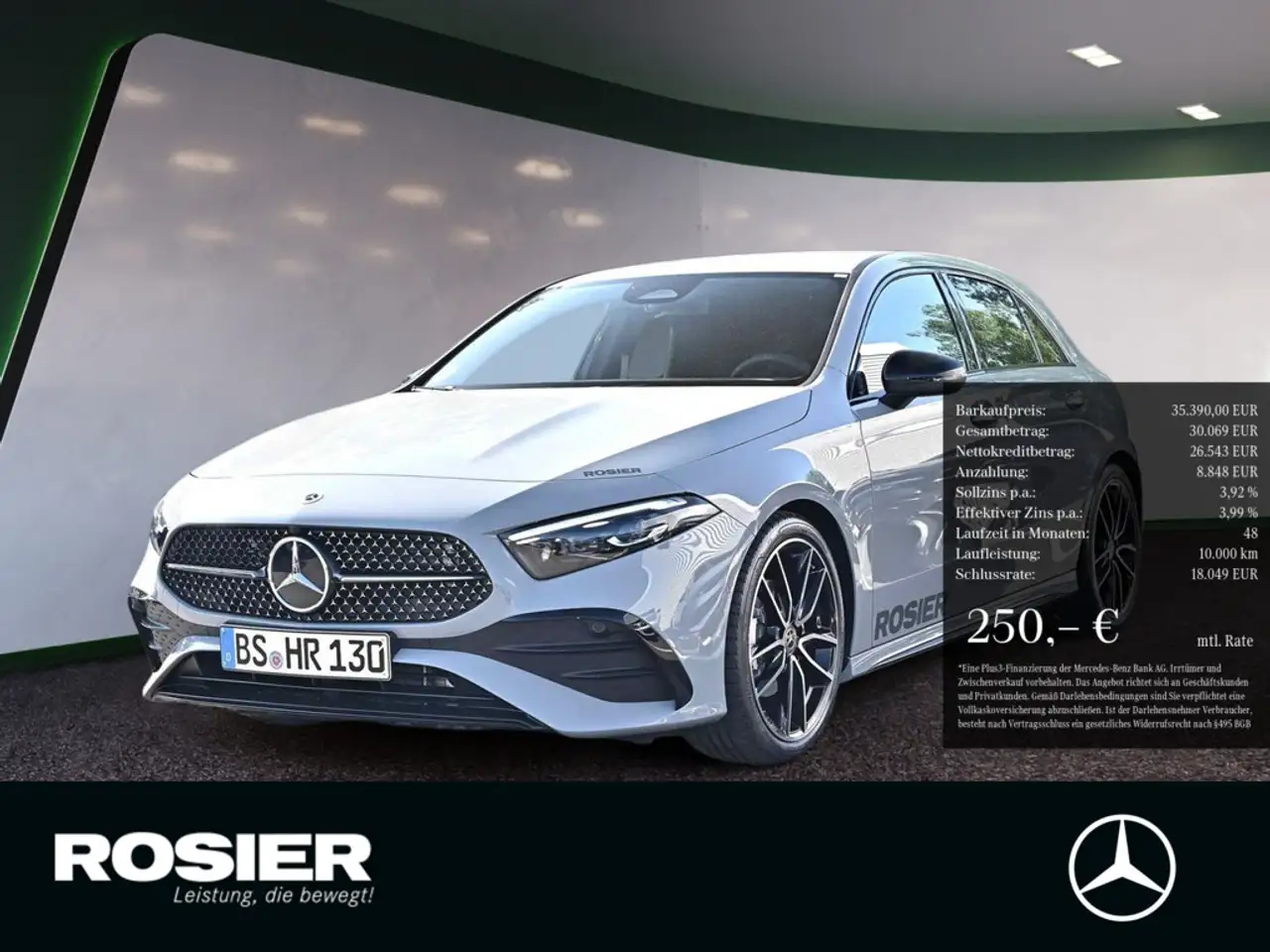 *Ein Plus3-Finanzierung-Finanzierungsbeispiel der Mercedes-Benz Bank AG, Siemensstraße 7, 70469 Stuttgart für Privatkunden und Geschäftskunden: 250,41 EUR monatl. Rate, 3,99 Prozent eff. Jahreszins bei 48 Monaten Laufzeit, einer Anzahlung von 8.847,50 EUR, einer jährlichen Laufleistung von 10.000 km und einer Schlussrate von 18.048,90 EUR. (Sollzins gebunden p.a. 3,92 Prozent, Gebühren 0,00 EUR, Kosten für Ratenabsicherung 0,00 EUR, Bruttokreditbetrag: 30.068,65 EUR, Nettokreditbetrag: 26.542,50 EUR)