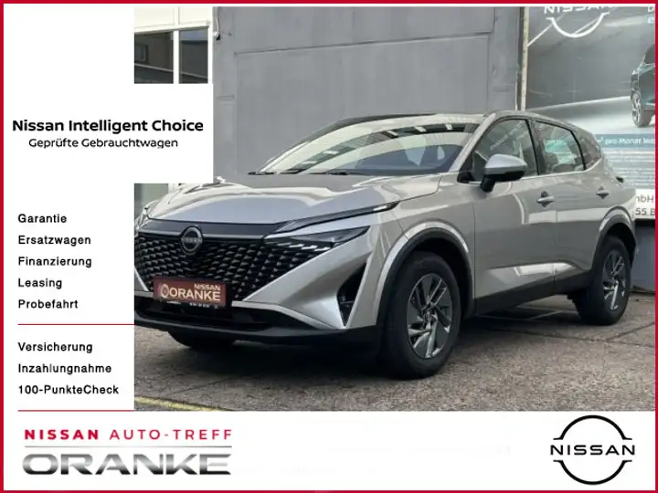 Innenausstattung, Ablagefächer in den vorderen und hinteren Türen, Handschuhfach, beleuchtet, Sonnenbrillenfach, Ausklappbare Mittelarmlehne hinten mit 2 Getränkehaltern, Dachhimmel in hellgrau, Kofferraumbeleuchtung, Lenkrad und Schalthebelknauf, lederummantelt, Lenksäule, höhen- und tiefenverstellbar, Leselampe, vorne und hinten, Sonnenblenden mit Make-up Spiegel, beleuchtet, Klimaautomatik, 2 Zonen, inkl. Pollenfilter, Beifahrersitz manuell höhenverstellbar, Fahrersitz: manuell höhenverstellbar, mit 2-fach elektrisch einstellbarer Lordosenstütze, Rückenlehne asymmetrisch (60:40) umklappbar, Sitzbezüge Stoff „Black“, Sicherheit und Technik, ABS mit elektronischer Bremskraftverteilung (EBD), Berganfahr-Assistent, Einparkhilfe, hinten, ESP, Fernlicht-Assistent, Geschwindigkeits-Regelanlage und Speed Limiter, Intelligenter Spurhalte-Assistent aktiv mit korrigierendem Bremseingriff, Querverkehrs-Warner, Rückfahrkamera in Farbe, Verkehrszeichenerkennung, Intelligenter Adaptiver Geschwindigkeits- und Abstands-Assistent, 8"-Farbdisplay mit Touchscreen, Reifendruck-Kontrollsystem (TPMS - tyre pressure monotoring system), 6 Lautsprecher, Apple CarPlay® und Android Auto®, Auto-Hold-Funktion, Digitalradio (DAB), Fahrerinformationssystem mit 7"-TFT-Farbdisplay, Haifisch-Antenne, Lenkradfernbedienung, Nissan Help & Support, NissanConnect Infotainment, Elektronische Parkbremse (e-PKB) mit automatischer Deaktivierung beim Anfahren, Fensterheber elektrisch, vorne und hinten, Intelligent Key mit Keyless Entry und Start/Stopp-Knopf, Airbags, Fahrer- und Beifahrerairbag, Intelligente Müdigkeitserkennung, Intelligenter Autonomer Notbrems-Assistent hinten für feststehende und sich langsam bewegende Objekte, Intelligenter Autonomer Notbrems-Assistent vorne mit Fußgänger- & Radfahrererkennung und Kreuzungs-Assistent, Intelligenter Frontkollisionswarnungs-Assistent, ISOFIX-Kindersitz-Befestigungspunkte, hinten, auf den äußeren Plätzen inkl. Top Tether(R), Notruf und Pannenanruf (eCall), Perimetrische Alarmanlage, Seitenairbags vorne, Totwinkel-Assistent aktiv mit korrigierendem Bremseingriff, Vorhang-Airbag, Warnblinkautomatik, Zentralairbag, rechte Seite des Fahrersitzes, 2 USB-Eingänge (Typ C) in der Mittelkonsole, D-Mode Schalter: Auswahl des Fahrmodus "Standard", "Eco" oder "Sport", Steckdose, 12-Volt, 2-fach