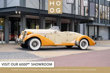 Stelt u zich voor: u loopt onze showroom in Katwijk binnen. Het eerste wat u ziet, is deze adembenemende Auburn Speedster Supercharged, glanzend in zijn zachte beige lak, wachtend om bewonderd te worden. U opent de deur, voelt het leder van de stoelen en ruikt de onmiskenbare geur van een klassieke auto. U ziet de glinstering van het dashboard, de chromen details en de elegante lijnen die u uitnodigen om achter het stuur plaats te nemen.