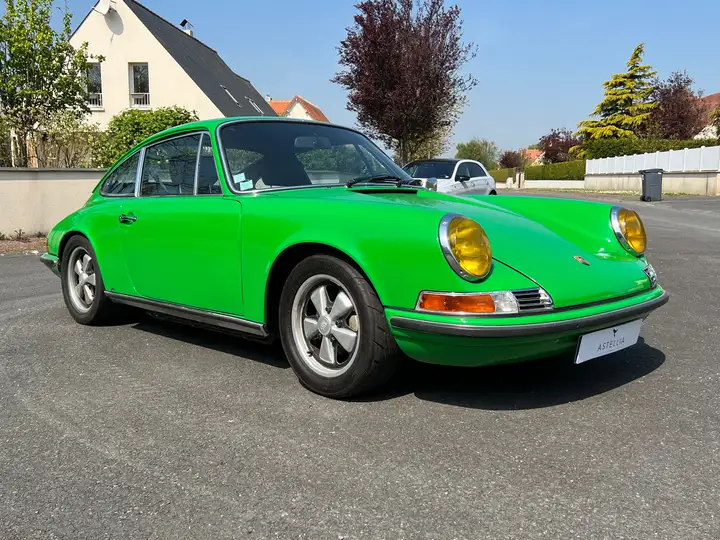 PORSCHE 911 2,2 E Coupé injection de couleur verte, intérieur noir, boite de vitesse mécanique à cinq rapports + jantes alliage FUSCH d’origine, phares jaunes d’époque