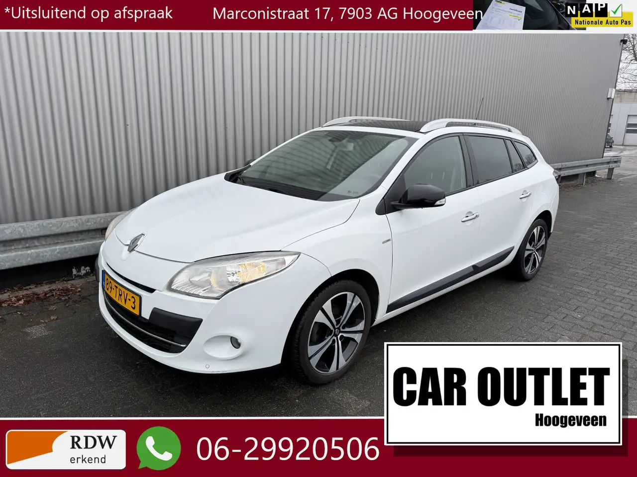 WIJ ZIJN ALLEEN OPEN OP TELEFONISCHE AFSPRAAK. Nette en goed rijdende Renault Mégane Estate 1.4 TCe Bose met o.a. Automatische Klimaatregeling, High-End Audiosysteem, Half Leder/Stof interieur, Panoramisch Glazen Dak, Navigatiesysteem, Bluetooth (Carkit), Cruise Control, Park Distance Control en Origineel Licht Metaal. Inruil is uiteraard bespreekbaar.