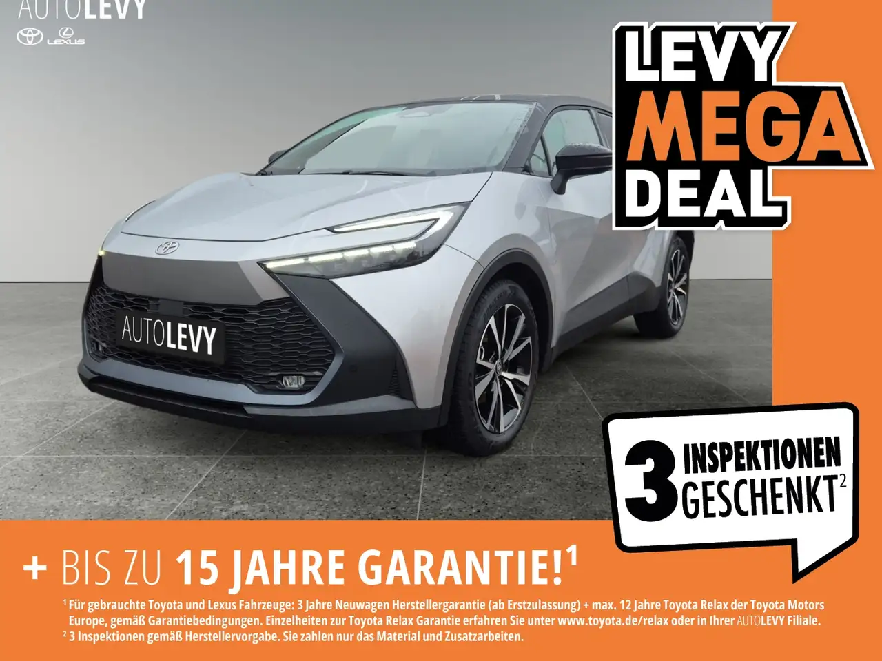 - Bis zu 15 Jahre Garantie (3 Jahre Neuwagenherstellergarantie und max. 12 Jahre Toyota Relax Anschlussgarantie der Toyota Motor Europe - gemäß Garantiebedingungen unter www.toyota.de/relax) und ON TOP 3 Inspektionen (Details siehe autolevy.de/garantieversprechen) geschenkt. Inspektion gem. Herstellervorgabe zzgl. Material und Zusatzarbeiten – nur gültig in unseren Filialen.