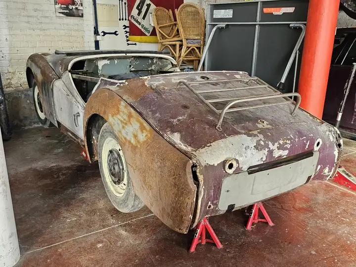 A vendre Triumph TR3B a restaurer complètement.. La structure du châssis a déjà été faite il y a quelques années mais la caisse en elle même est a restaurée complètement.