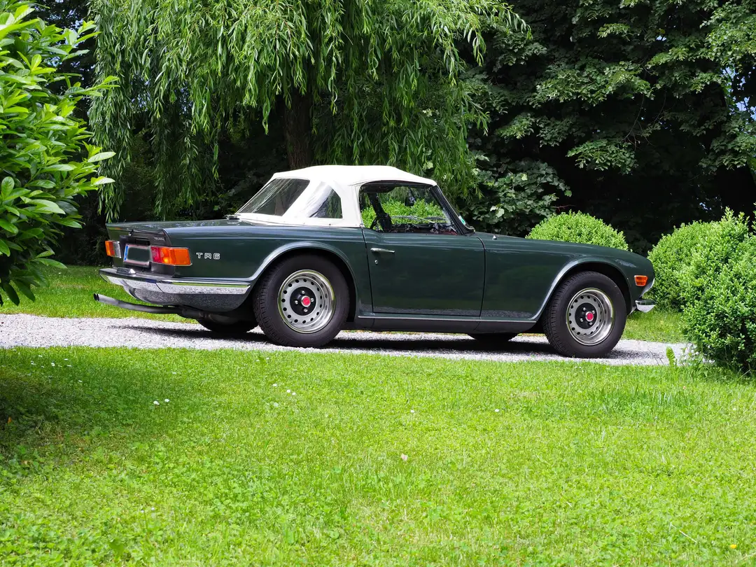 Triumph TR6 PI , british racinggreen, mit dem kräftigen 150PS Einspritzmotor aus der ersten Serie, aus langjährigem italienischem Vorbesitz, KM-Stand abgelesen 43.000km - aufgrund des sensationellen, originalen Gesamtzustandes glaubhaft nachvollziehbar, Matching Numbers, Overdrive 2.-4. Gang, Erstlack.