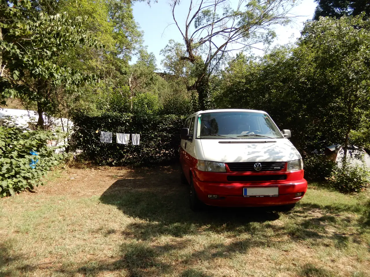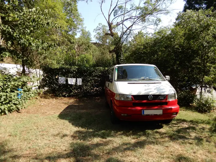 Neben dem nachgerüsteten Tempomat verfügt der T4 über eine Klimaanlage sowie ein Radio mit Bluetooth, was ihn vor allem auf längeren Urlaubsfahrten sehr angenehm macht. Die hinteren Sitze lassen sich einfach umklappen und ergeben eine Liegefläche. Wir haben den Bus selbst mehrere Jahre als Urlaubsfahrzeug genutzt und er ist wirklich ideal für Campingtrips.