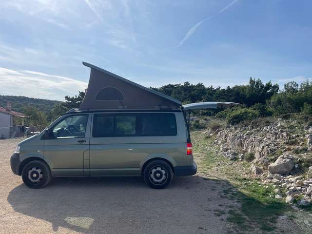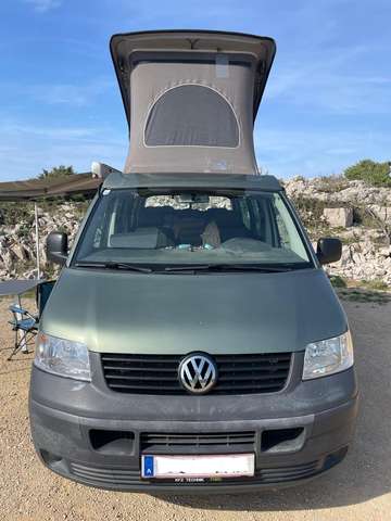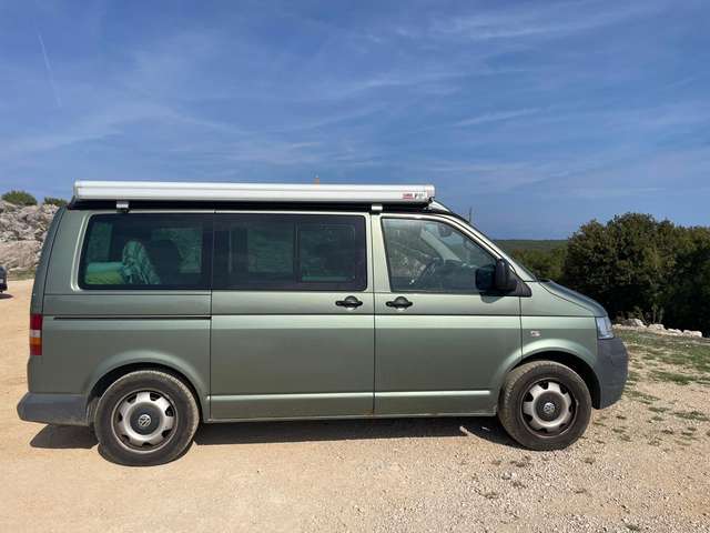 Der Multivan ist mit einer Markise ausgestattet und in der Schiebetür befindet sich ein Tisch zum Rausnehmen.
