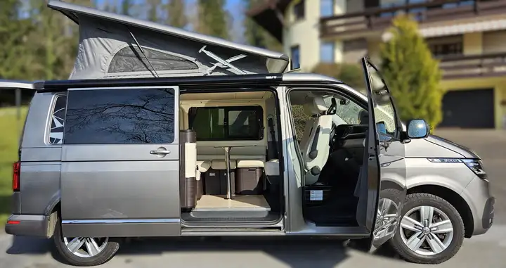 der komplettere Cali in Premium-Ausstattung mit WC und Indoor-Dusche (einzigartiges Konzept im Vergleich zum klass. California) für komfortables Reisen und autarkes Camping! Mit 199 cm Fahrzeughöhe voll alltagstauglich, passt in praktisch jede (Tief-)Garage! Unverbastelt!