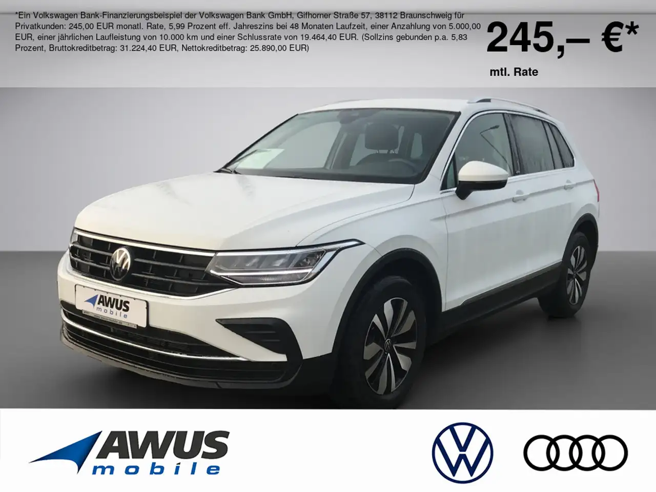 *Ein Volkswagen Bank-Finanzierungsbeispiel der Volkswagen Bank GmbH, Gifhorner Straße 57, 38112 Braunschweig für Privatkunden: 245,00 EUR monatl. Rate, 5,99 Prozent eff. Jahreszins bei 48 Monaten Laufzeit, einer Anzahlung von 5.000,00 EUR, einer jährlichen Laufleistung von 10.000 km und einer Schlussrate von 19.464,40 EUR. (Sollzins gebunden p.a. 5,83 Prozent, Bruttokreditbetrag: 31.224,40 EUR, Nettokreditbetrag: 25.890,00 EUR)