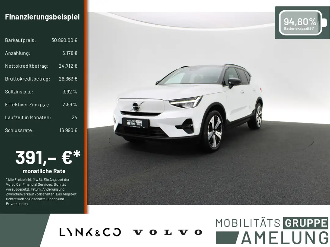 *Ein Aktions Zielfinanzierung-Finanzierungsbeispiel der Volvo Car Financial Services, Santander-Platz 1, 41061 Mönchengladbach für Privatkunden und Geschäftskunden: 390,55 EUR monatl. Rate, 3,99 Prozent eff. Jahreszins bei 24 Monaten Laufzeit, einer Anzahlung von 6.178,00 EUR, einer jährlichen Laufleistung von 10.000 km und einer Schlussrate von 16.989,50 EUR. (Sollzins gebunden p.a. 3,92 Prozent, Gebühren 0,00 EUR, Kosten für Ratenabsicherung 0,00 EUR, Bruttokreditbetrag: 26.362,76 EUR, Nettokreditbetrag: 24.712,00 EUR)